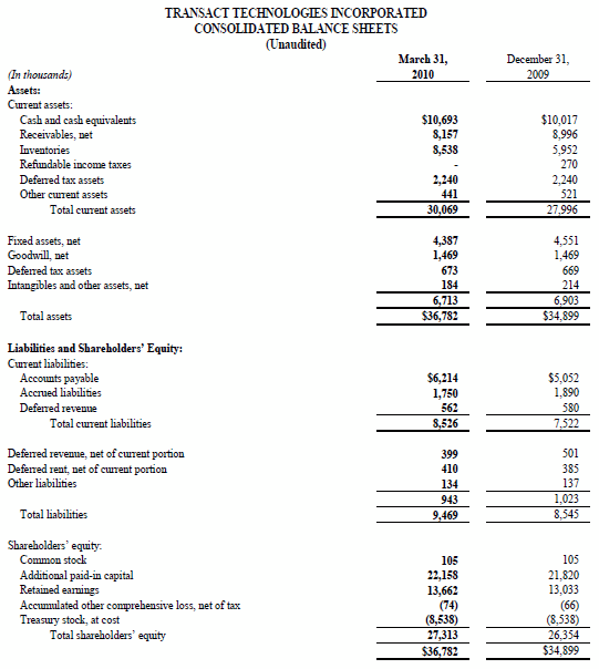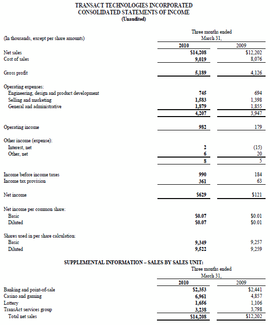 HAMDEN, CT - May 5, 2010 - TransAct Technologies Incorporated (NASDAQ: TACT), a global leader in market-specific printers for transaction-based industries, today announced financial results for the three months ended March 31, 2010. Summary results for the period are as follows: