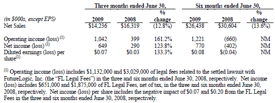 Revenue for the six months ended June 30, 2009 was $26.4 million, a decrease of 14% compared to $30.6 million in the prior-year period. Gross margin for the six months ended June 30, 2009 was 34.0%, an increase of approximately 50 basis points from 33.5% in the prior-year period. Operating expenses were $7.8 million, a decrease of $3.1 million from the prior-year period driven largely by the absence of $3.0 million of legal fees incurred in the prior-year period in connection with the now-settled litigation with FutureLogic, Inc., as well as a reduction in overall operating expenses from cost reduction actions taken during 2009. The Company recorded net income of approximately $0.8 million, or $0.08 per diluted share, for the six months ended June 30, 2009, compared to a net loss of approximately $0.4 million, or $0.04 per share, for the prior-year period in 2008. Severance costs reduced net income and earnings per share in the first half of 2009 by $0.1 million and $0.01, respectively, while legal fees associated with the FutureLogic, Inc. litigation reduced net income and diluted earnings per share in the first half of 2008 by $1.9 million and $0.20, respectively.